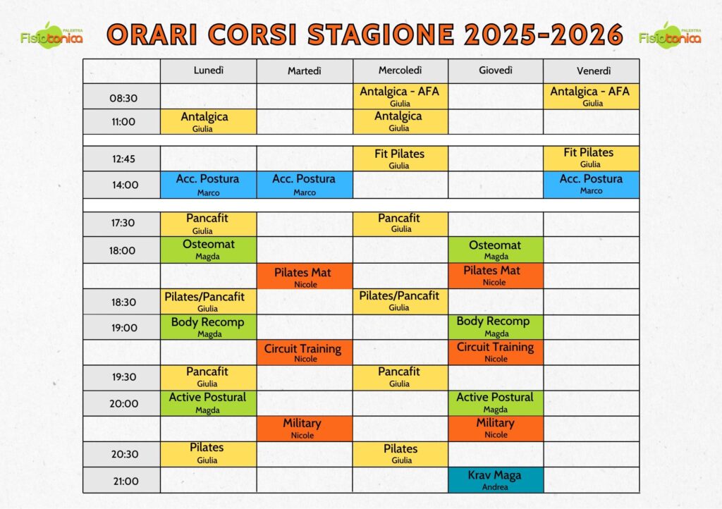 Di seguito è possibile consultare gli orari della sala pesi e di tutti i corsi presenti nella Fisiotonica, per ulteriori informazioni non esitare a contattarci nella pagina Facebook o al numero di telefono: 0421 72198